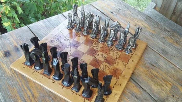 „Niekas net pagalvoti negalėtų, kad juos pagaminau iš akėčių virbų: vienoms figūroms geležį nubalinau iki sidabro baltumo, kitoms – užgrūdinau metalą tepalu. Buvo labai daug darbo, gerokai užtrukau, bet rezultatas širdžiai malonus, todėl baigęs nukaldinti figūras pagaminau ir originalią šachmatų lentą“, – rodydamas kalvės kūrinių nuotraukas pasakoja R. Labaitis.