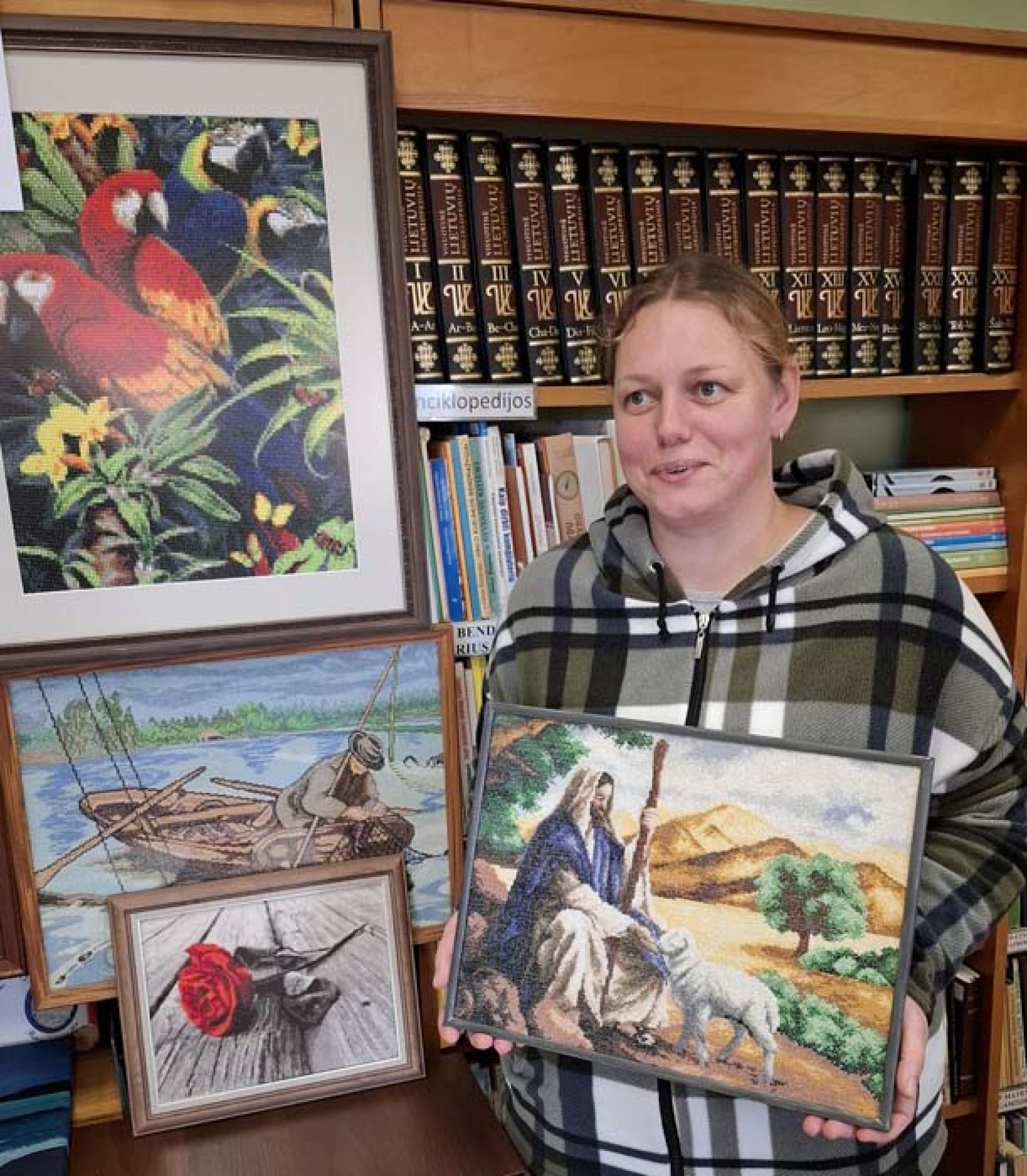 „Susidomėjimas siuvinėjimu paskatino ir skaityti – pradėjau bibliotekoje ieškoti informacijos apie rankdarbius, o kuo labiau gilinausi, tuo daugiau norėjau žinoti, padaryti geriau. Taip, matyt, tas rankdarbių ratas manyje ir užsisuko. Iš pradžių ėmiausi mažų darbelių – siuvinėjau aplikacijas atvirukams ir jas dovanojau. Po truputį pasklido žinia apie mano rankdarbius. Įgudusi jau ryžausi ir didesniems darbeliams – pagalvėlėms, pusmetrio ploto paveikslams“, – pasakoja traksėdiškė.