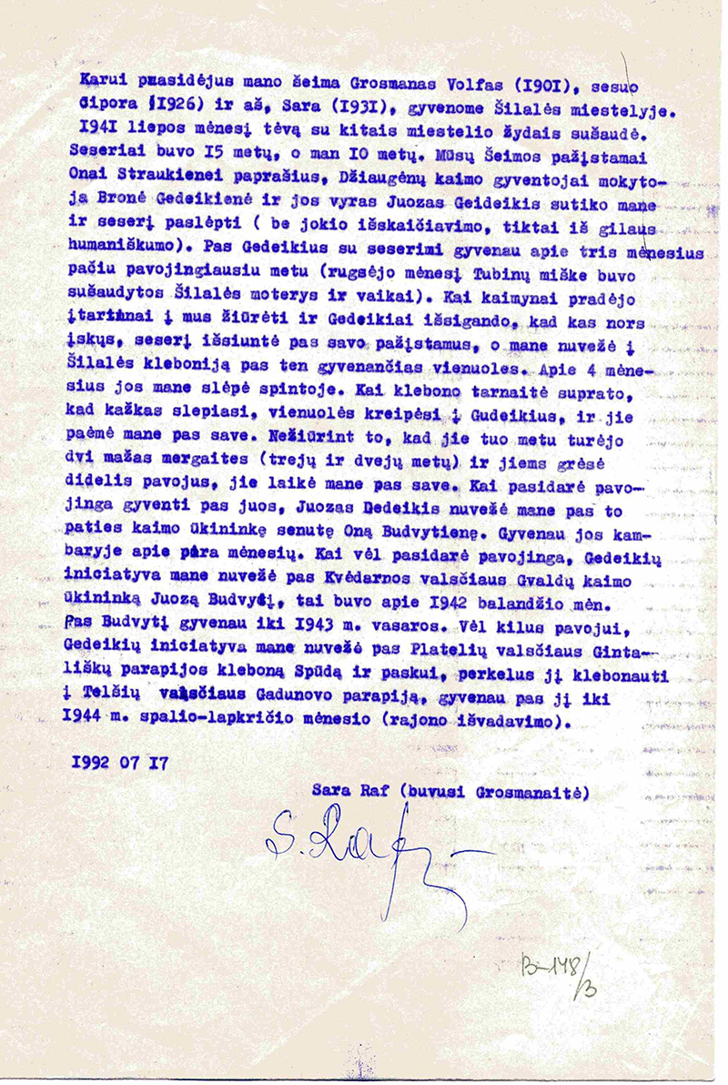 Tarp Šilalės krašto žydų gelbėtojų – Bronė Gedeikienė ir Juozas Gedeikis (sėdi). Iš kairės: Gedeikių dukterys Milda ir Irena, Sara Raf-Grosmanaitė, Gedeikių duktė Nijolė. 1978 m. Tarp Šilalės krašto žydų gelbėtojų – Bronė Gedeikienė ir Juozas Gedeikis (sėdi). Iš kairės: Gedeikių dukterys Milda ir Irena, Sara Raf-Grosmanaitė, Gedeikių duktė Nijolė. 1978 m.